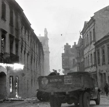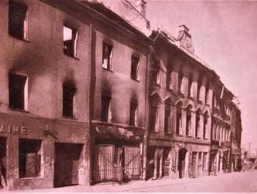 Vilnius. Vakarinė Pilies gatvės pusė. Sudeginta 1944 m. liepos 11 d. Namai įgriuvusiais stogais ir perdangomis pokaryje išstovėjo 10 metų neatstatomi ir buvo nugriauti. 1944 m. vasara. J.Bulhak nuotr.